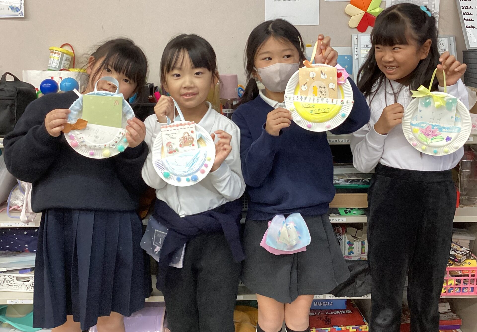 25.11.25 ブログ いつもありがとう💕 勤労感謝の日に向けて、お家の方へのプレゼントを作りました。 みんな、一生懸命に日頃の感謝の気持ちを込めて制作していました。 紙皿に絵を描いたり、飾りを貼り付けたり・・・とっても可愛く仕上がりました。 喜んでもらえるといいね✨ 一覧へ戻る